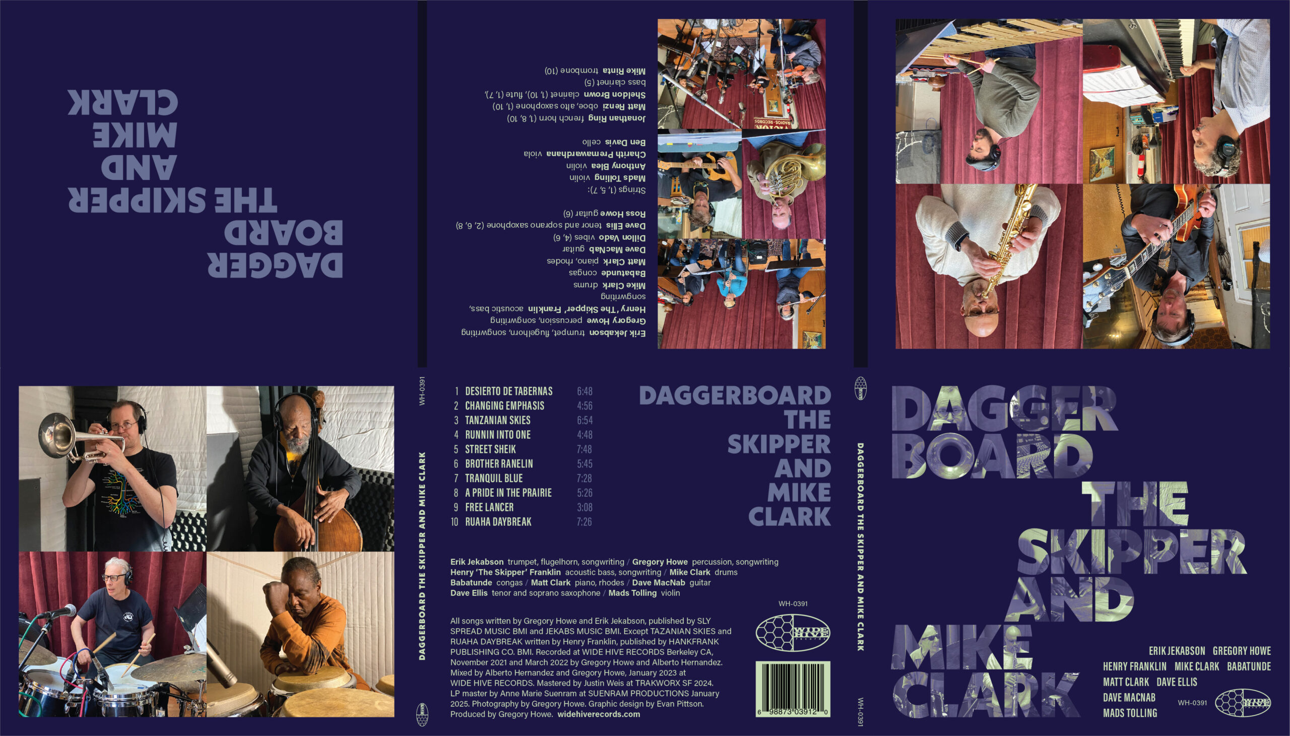Album cover, Vinyl and CD packaging design for Daggerboard, the creative musical partnership of Gregory Howe and Erik Jekabson, on Wide Hive Records. With all original music by Howe and Jekabson, the album features bassist Henry “The Skipper” Franklin and drummer Mike Clark.