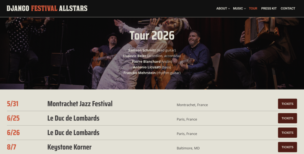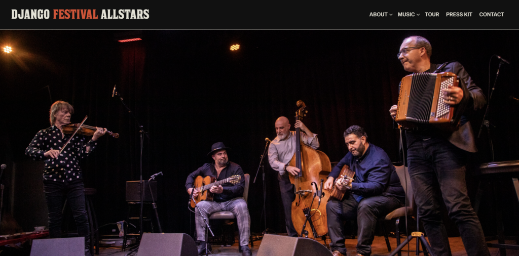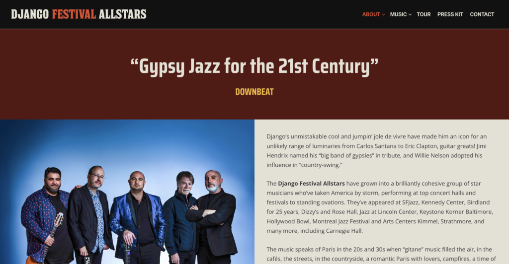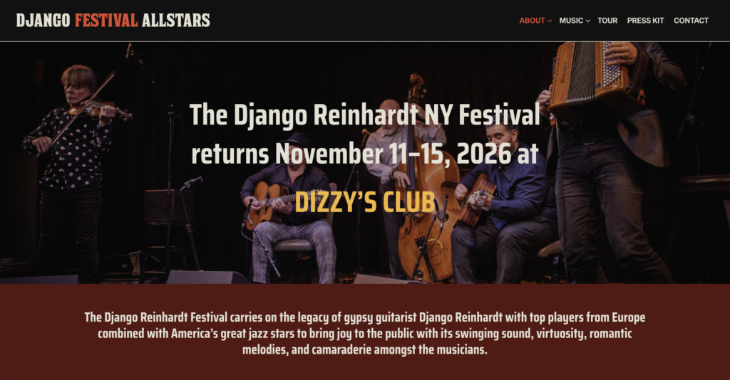 Website design for the Django Festival Allstars, an International touring band with original music in the jazz manouche style. This website was designed to promote the release of DFA’s latest album “Evolution” on Motéma Music.